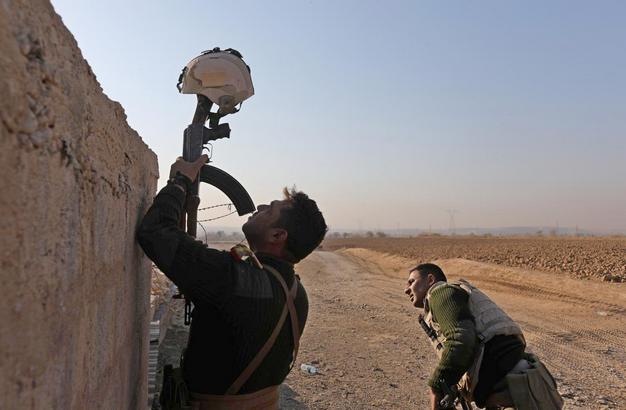 Ιρακινός στρατιώτης χρησιμοποιεί το όπλο του για να κρατήσει ψηλά ένα κράνος ως δόλωμα κατά την διάρκεια συγκρούσεων με μαχητές του Ισλαμικού Κράτους στην Al-Qasar, νοτιοανατολικά της Μοσούλης, τον Νοέμβριο του 2016. GORAN TOMASEVIC / REUTERS
