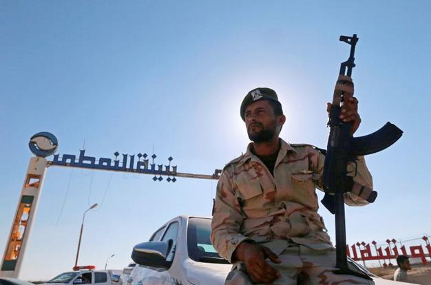 Ένα μέλος των δυνάμεων της Λιβύης πιστό στον ανατολικό διοικητή Khalifa Haftar κρατά ένα όπλο όπως κάθεται σε ένα αυτοκίνητο μπροστά από την πύλη στον τερματικό σταθμό πετρελαίου Zueitina στην Zueitina, δυτικά της Βεγγάζης, στις 14 Σεπτεμβρίου 2016. ESAM OMRAN AL-FETORI / REUTERS