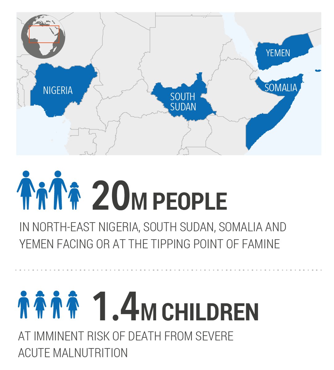 UN warns 20 million people are facing famine in Nigeria, South Sudan, Somalia + Yemen... Trump included Yemen + Somalia in his Muslim ban