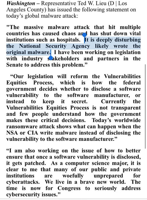 .@RepTedLieu: "It is deeply disturbing the National Security Agency likely wrote the original malware" behind today's massive cyberattack