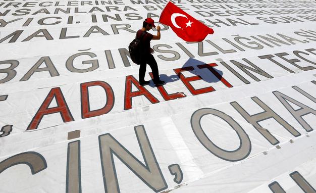 Ένας νεαρός περπατά σε ένα τεράστιο πανό, στην συγκέντρωση που σηματοδότησε το τέλος της «Πορείας για την Δικαιοσύνη», στην Κωνσταντινούπολη, στις 9 Ιουλίου 2017. Η λέξη με τα κόκκινα γράμματα σημαίνει «δικαιοσύνη». UMIT BEKTAS / REUTERS